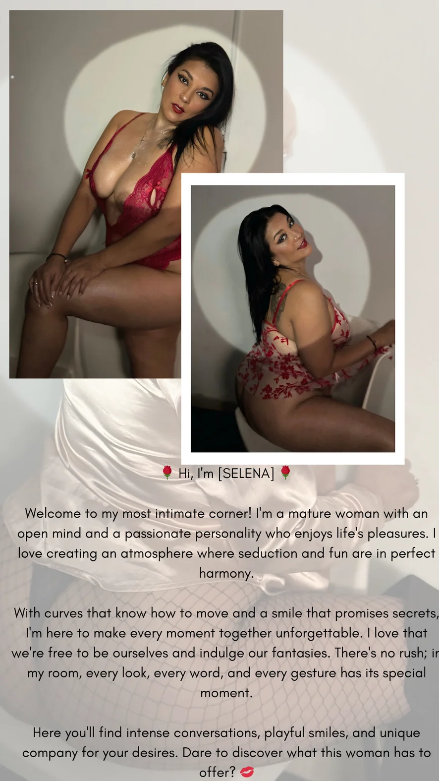 ¡Bienvenidos a mi rincón más íntimo! Soy una mujer madura, con una mente abierta y una personalidad apasionada que disfruta de los placeres de la vida. Me encanta crear un ambiente donde la seducción y la diversión se encuentran en perfecta armonía.